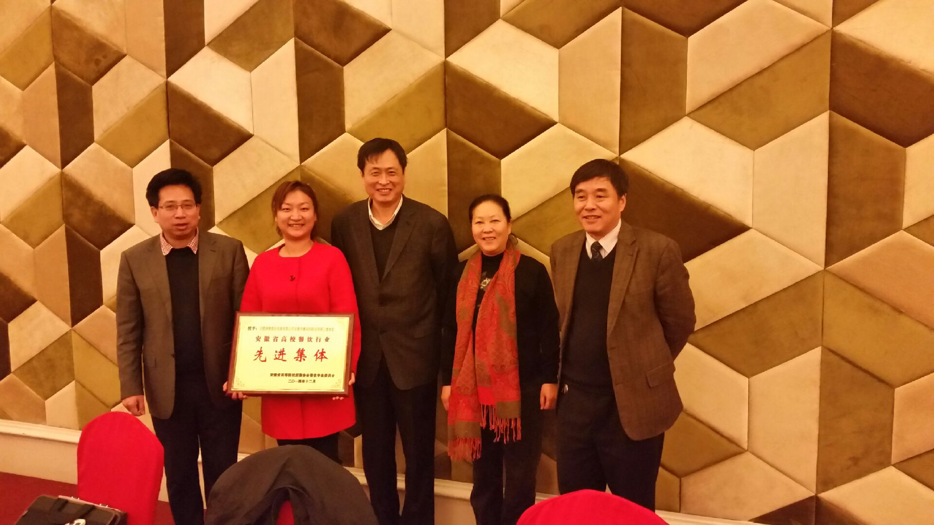 合肥绿滟商务发展有限公司与2013年荣获由安徽省高校后勤颁发的先进集体,图为公司总经理倪娜授奖并与后勤程鹏主任等合影留念!
